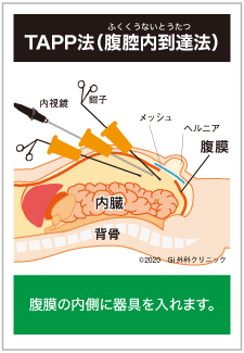 まず一つ目は腹腔内(お腹の中)に入り、腹膜(内臓を包む膜)を開けて腹壁を修復する方法(TAPP法)です。近年の報告(2013年)では、鼠径ヘルニアの腹腔鏡下手術の約75%はこの方法です。