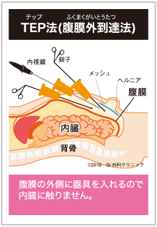 二つ目は、腹腔内には入らず、腹腔外で腹壁を修復する方法(TEP法)です。TEP法は鼠径ヘルニアの腹腔鏡下手術の約25%となっています。