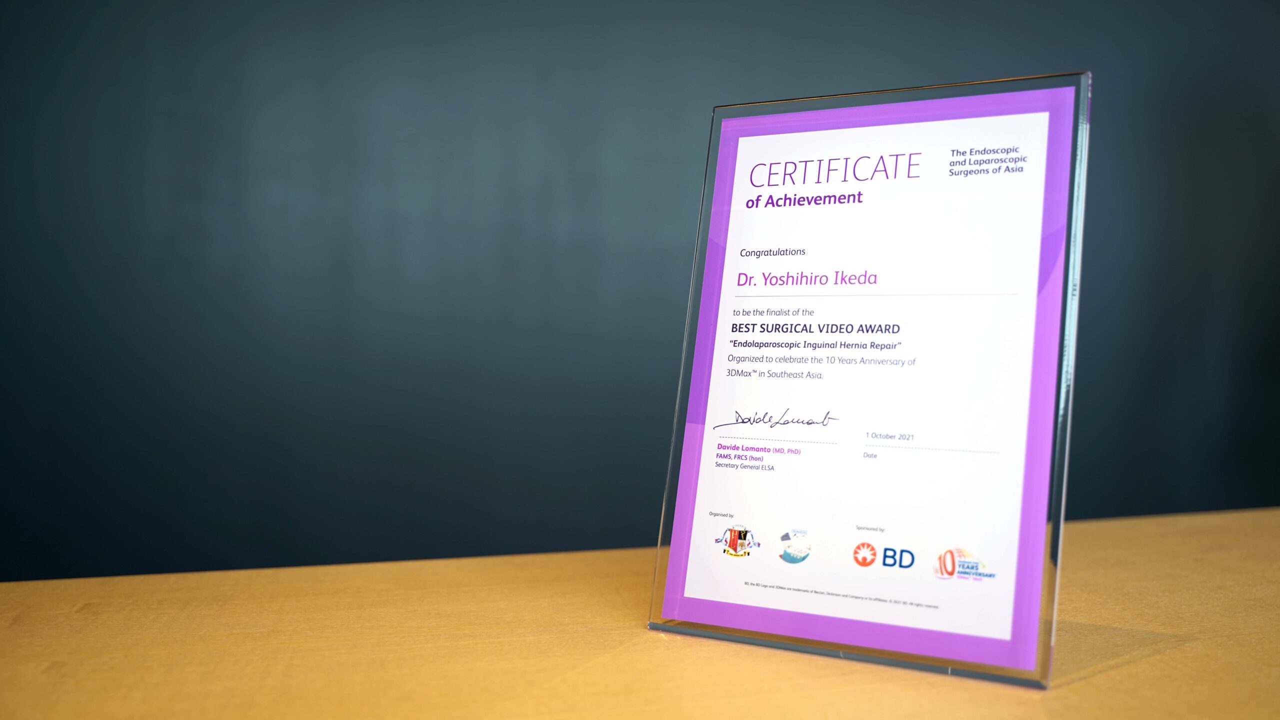 診療情報 アジア内視鏡外科学会の手術コンテストでトップ6に選ばれました! 2021.11.19 この度、アジア12ヵ国を対象に行われるアジア内視鏡外科学会(ELSA)の腹腔鏡下鼠径ヘルニア手術ビデオコンテストにおいて、池田院長がファイナリストの「トップ6」に選ばれました。 当院の治療技術が世界的に評価されたことは大変光栄です。 この度ご支援下さった皆様に感謝申し上げます。 今後もGi外科クリニックは、鼠径ヘルニアの患者さんにより良い治療ができるよう努めてまいります。 Tweet Share Hatena Pocket RSS feedly Pin it